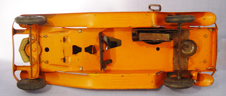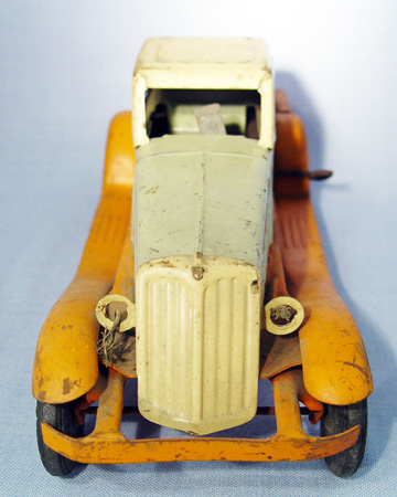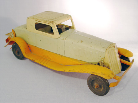 GIRARD PIERCE-ARROW COUPE: Steel key wind car. Ca. 1939. Beige, orange and green. Used condition with original Girard rubber tiles, loss of headlights. 14''l.