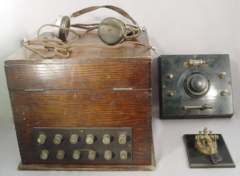 BBC BRITISH TELEGRAPH IN ORIGINAL OAK BOX: The label states this is ''listed under Marconi patents for domestic or private use only in Great Britain. The box is 10 1/2'' x 11 1/2'' x 11 3/4''.