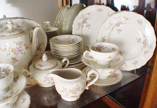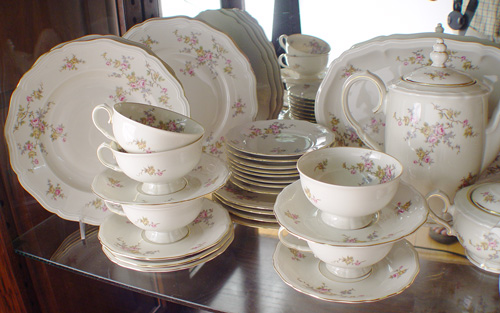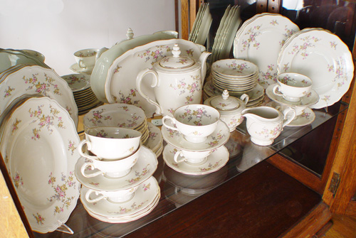 JOHANN HAVILAND BAVARIAN FINE CHINA SERVICE: 59 pieces to include 8 dinner plates, 8 low soup bowls, 8 salad plates, 8 bread plates, 8 dessert bowls, 7 cups, 8 saucers, a coffee or teapot, cream pitcher, covered sugar, and a 13'' platter.