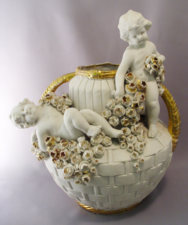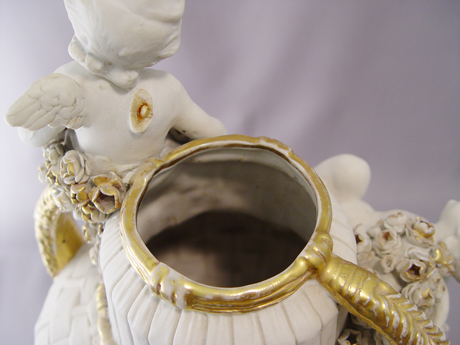 AUSTRIAN AMPHORA CHERUB VASE: All white with gold accentuating the roses and rim. 12 1/2''. Please note repair to wing.