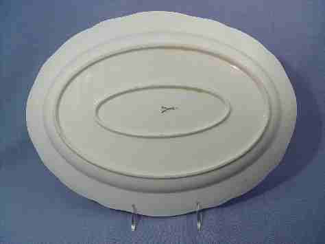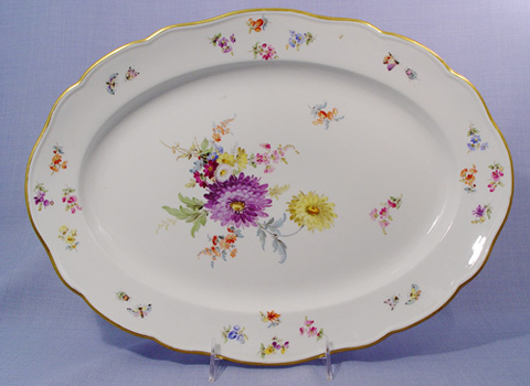 MEISSEN FINE GERMAN PORCELAIN PLATTER: Hand painted in flowers with a moth or butterfly here and there. 16 1/4''l. x 12''w. Blue cross swords mark underglaze, free of chip, cracks or repairs.
