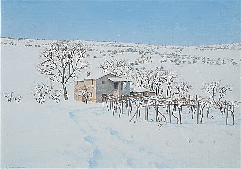 MURINKO, Joska, (Italian, 20th C.): ''Paesaggio Invernale'', O/C, 19 3/4'' x 27 1/2'', signed, signed and titled verso, silver gilt frame with wear, under glass, artist label verso.