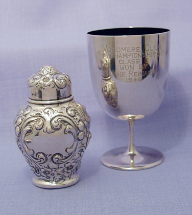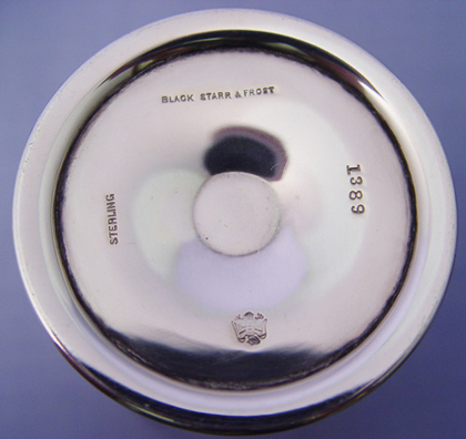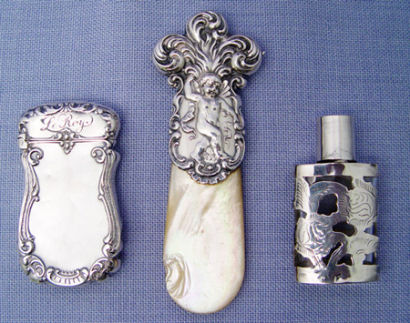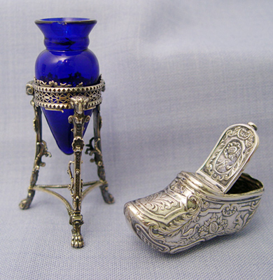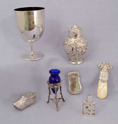 7 PIECE ESTATE COLLECTION OF UNUSUAL STERLING PIECES: 1) Repousse tea caddy by Mausser, 4''h. 2) Match safe by WS & Co. inscribed to LeRoy, 2 5/8''l. (shows some wear). 3) Mexican sterling overlay perfume bottle, 2 1/8''h. 4) Miniature cobalt glass vase in a sterling rams head stand (glass with small chip, the stand has issues) that we couldn't leave behind, 3 3/4''h. 5) Black Starr & Frost trophy goblet, 5''h. 6) A cherub sterling handle baby teether with mother of pearl, 4''h. 7) A fabulous little Dutch box in the form of a shoe, hinged top, embossed design includes animals, 1 1/8''h. x 2 3/4''l.