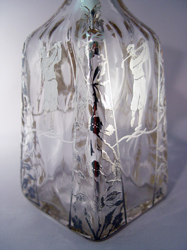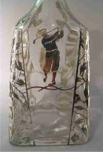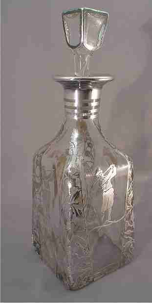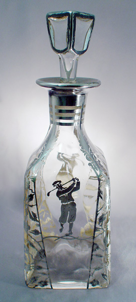 GOLF MOTIF SILVER OVERLAY DECANTER: Golfer dressed in early 20th C. garb. 11''h.