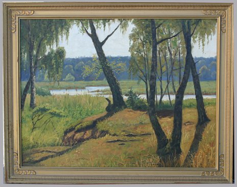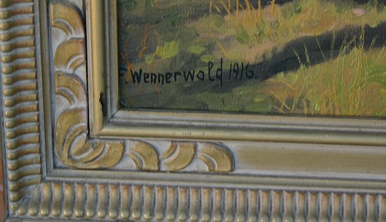 WENNERWOLD, Finn, (Danish, 1896-): Pastoral landscape, O/C/M, 26'' x 34'', signed LL, worn frame, 31'' x 39''.