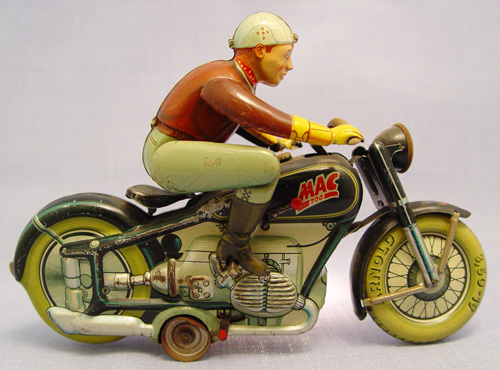VINTAGE MAC 700 GERMAN TOY TIN WIND UP MOTORCYCLE: Ca. 1950's, no key, 8''l.