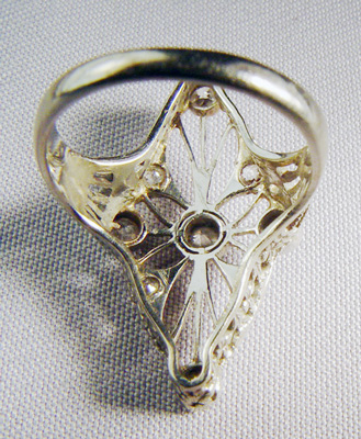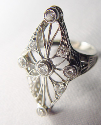 ESTATE DECO DIAMOND FILIGREE RING: Cobweb filigree ring of 18k white gold set with approx. 45pts total of tiny diamonds, size 3.75, 3.6 grams.
