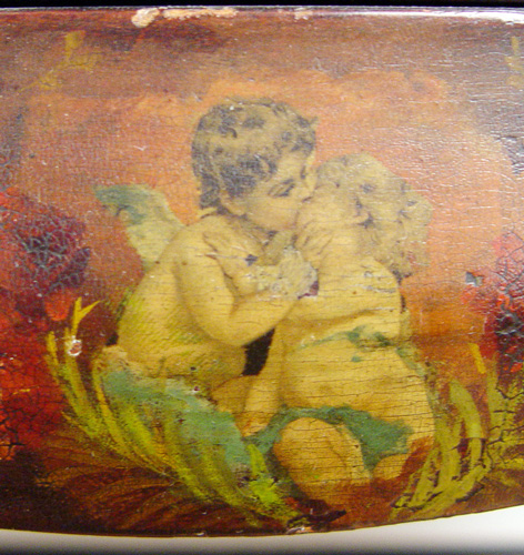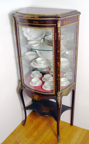 EARLY 20TH C FRENCH VERNIS MARTIN VITRINE: Upright display cabinet painted in cherubs and flowers, ormolu mounts, bowed glass front, mirror back, glass shelves. 57''h x 26'' x 15''.