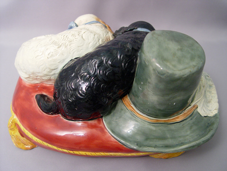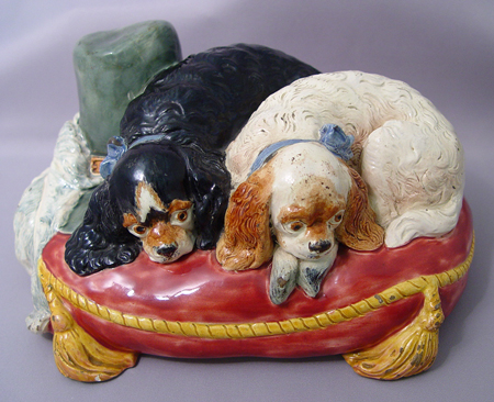 STAFFORDSHIRE SPANIEL DOGS ON PILLOW: Polychrome model of two dogs on pillow along with a plumed hat. 5'' x 10'' x 7''.