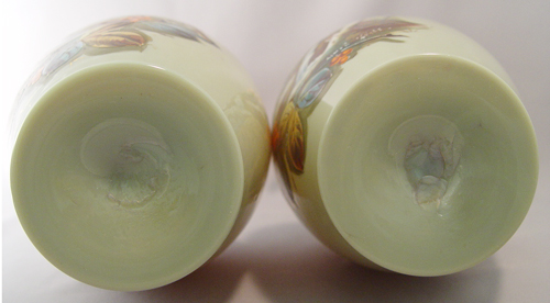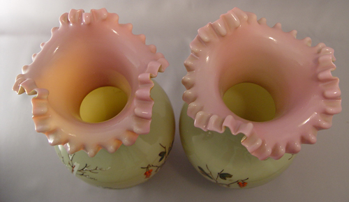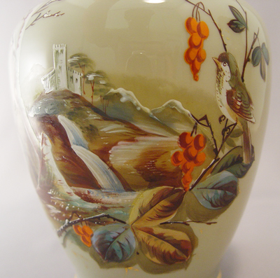 VICTORIAN ENAMELED ART GLASS VASES: Blown glass with hand painted bird in landscape scene, ruffle top. 10 1/2''
