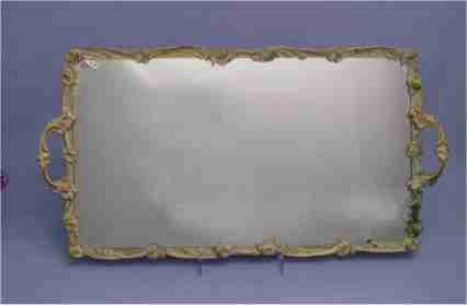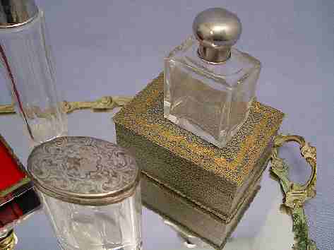 JEAN DE PARYS SOUS LE GUI PERFUME BOTTLE IN BOX: Black glass with gilt glass lid, 5'' long red fringe on the 4 1/8'' bottle; The box is in slightly worn condition, the stopper has a chip. Sold with a trio of glass bottles and a Guerlain hinged top box. The oval jar has a London silver lid, the tall bottle and shorter one have plated lids.