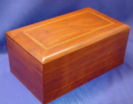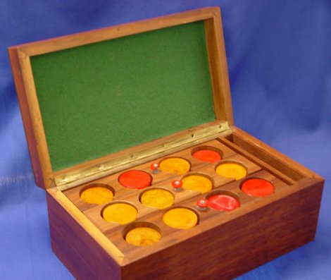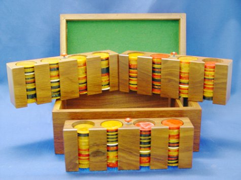 PARQUETRY INLAY MAHOGANY BOX WITH BAKELITE POKER CHIPS: Approx. 250 chips in butterscotch, red and navy blue. Three racks or holders fit snuggly in the box with compartment for note pad or cards. Please note chip on one of the rack knobs. The box is 5''h. x 11'' x 6 1/2''.