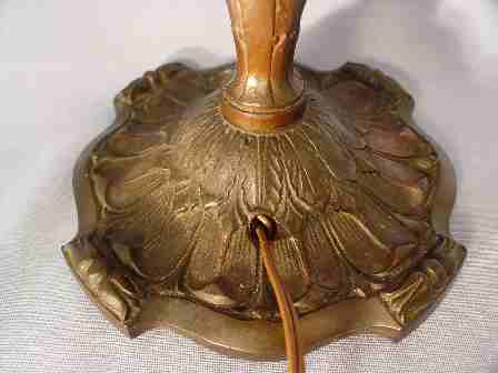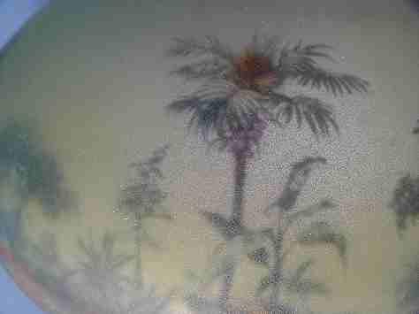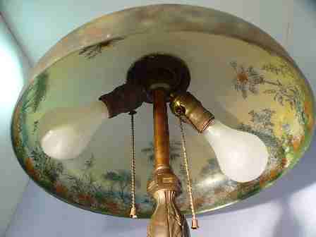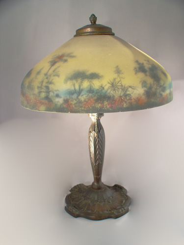 PITTSBURGH REVERSE PAINTED TABLE LAMP: The shade painted in lush tree tropical foliage with palm trees. Bronzed base, unsigned. 2 pull chain sockets. 19''h., the shade is 14'' dia. Please note chip on rim interior.