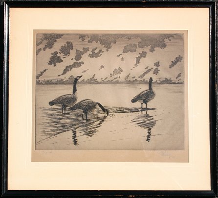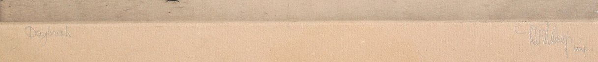 BISHOP, Richard, (American, 1887-1975) : ''Daybreak'', Etching, 10'' x 11 3/4'' sight size, pencil signed and titled in the margin, 14 3/4'' x 16'' with black frame. Toning throughout.