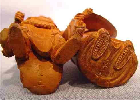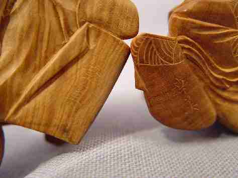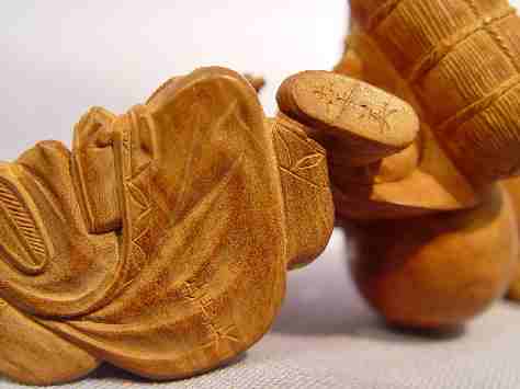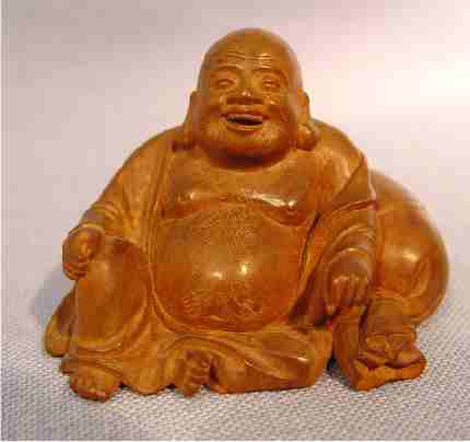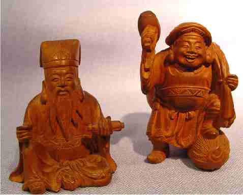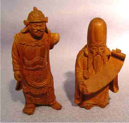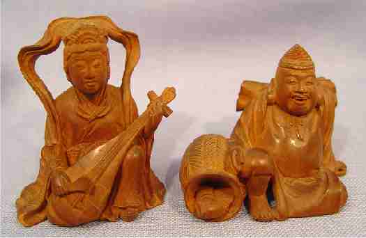 7 ARTIST SIGNED ORIENTAL CARVED WOOD FIGURES: Includes Buddha and Quan Yin. Except for the Shogun with his smoothed off hand they are in very good condition.