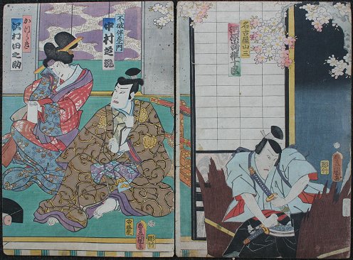 19TH C. JAPANESE WOODBLOCK DIPTYCH: 2 prints, 14'' x 9 1/2'', unframed, sold as is, Toyokuni chop mark.