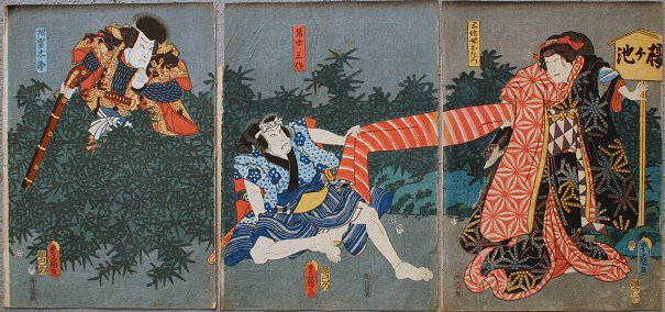TOYOKUNI JAPANESE WOODBLOCK TRIPTYCH: 14'' x 10'', unframed, depicting kabuki scene, 2 men and a woman afraid, all prints have chop. Creasing throughout, mild stain and fading, sold as is.
