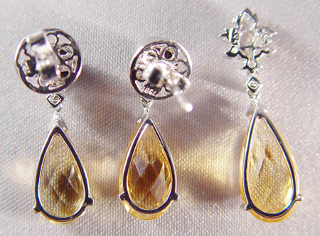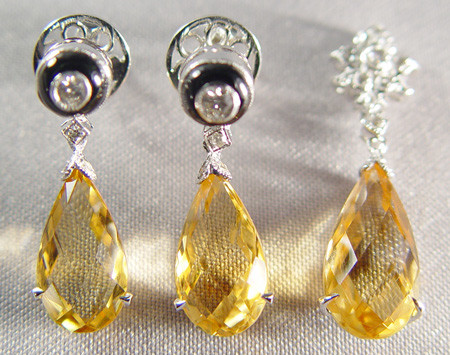 CITRINE, DIAMOND AND ONYX ENSEMBLE: Pendant and earrings set with briolette cut citrines. Pendant of 14k white gold holds a 3.84ct citrine and 12 tiny full cut diamonds, .09ctw, 1 1/8''l., 1.6 grams. Post back earrings of 18k white gold set with rings of onyx around small diamonds, .04ct each, supporting dangles of citrines, approx. 6.05ctw and tiny diamonds, 7/8''l., 4.5 grams. Sold as a lot.