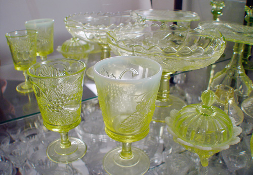 12 PIECE ESTATE GROUP OF VASELINE GLASS: To include a pair of 8'' candle holders, a cake stand, 9 1/2'' dia. compote, hand vase, shoe, 2 1/2'' candles, 2 salts, opalescent covered candy dish, fruit design goblets and toothpick holder.