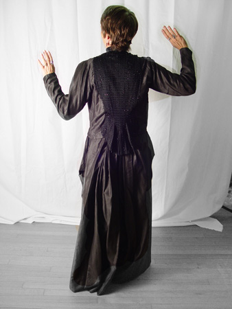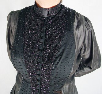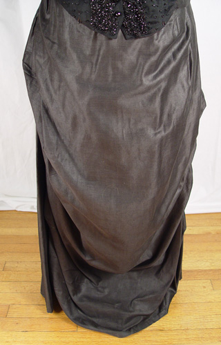 2 PIECE VICTORIAN BUSTLE SKIRT AND BEADED TOP: Beaded bodice buttons down the back, the beads are intact save for a small patch of loose beads in the back. A medium size.