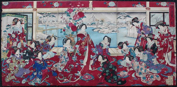 GEISHA GIRL JAPANESE WOODBLOCK TRIPTYCH: 13 1/2'' x 27 1/4'', reinforced backing, tear repair visible verso, sold as is.