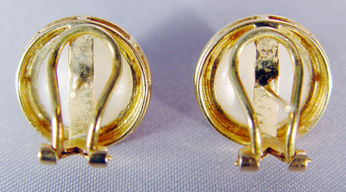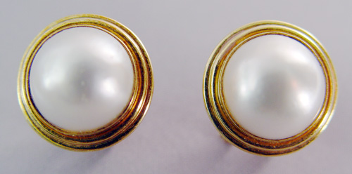 ESTATE MABE PEARL EARRINGS: 18k yellow gold omega post back earrings set with 12mm white mabe pearls, marked 750, 9.9 grams.