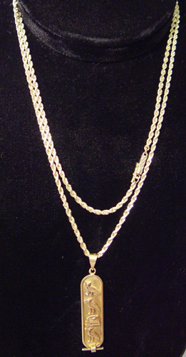 ESTATE 18K GOLD EGYPTIAN PENDANT NECKLACE: A cartouche pendant with hieroglyphic symbols, acid tests 18k, marked with VI front and back, on a 30'' chain of 14k yellow gold. Overall 17 grams.