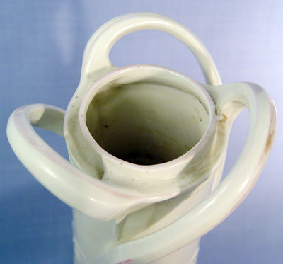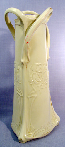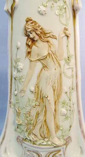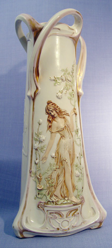EARLY 20th C ART NOUVEAU VASE: Very Amphora style with raised image of a maiden, 14'' h. Gold is worn.