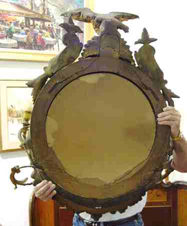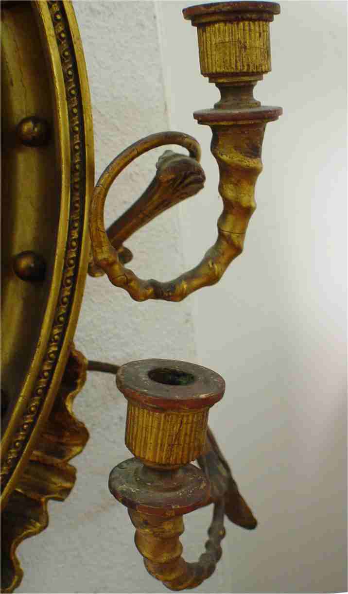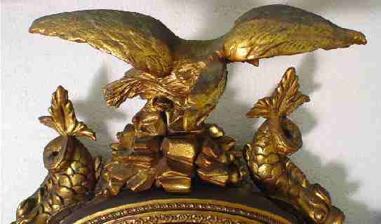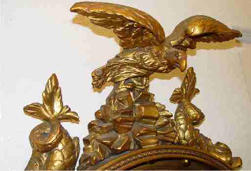 19th C AMERICAN GILT CONVEX MIRROR: Elaborate carved and gilt wood frame crested by an eagle flanked by dolphin fish over 2 light candle holders. Bulls-eye framing the convex glass. 37''h. x 29''w. overall, the glass alone is 17'' dia. Est. $800/1200**