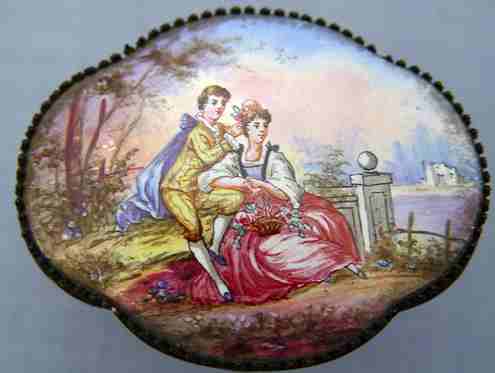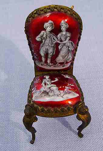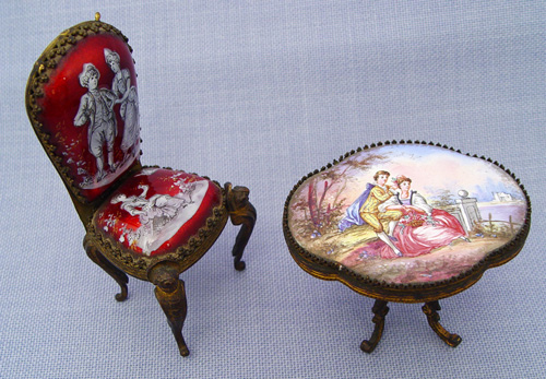 MINIATURE VIENNESE ENAMEL TABLE & CHAIR: The chair is red enamel with black and white figures, 3''h. The table top has courting couple scenario and leans a bit to the side. 1 3/4''h, 2 1/4''l. Please note wear to the gold finish on the metal.