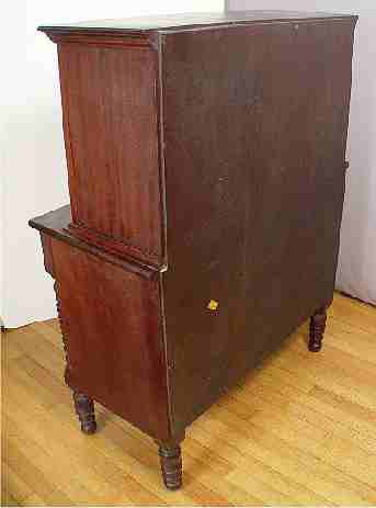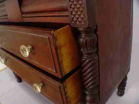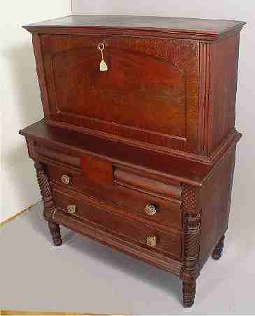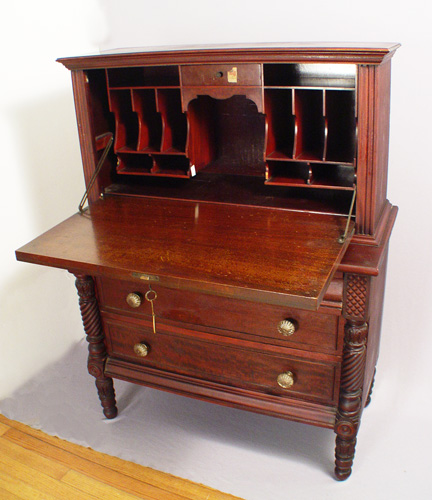 FEDERAL STYLE DROP FRONT MAHOGANY DESK: Recessed drop front desk with interior pigeon holes and drawers, over three full length drawers with glass pulls. 47 1/2'' x 36'' x 17''.