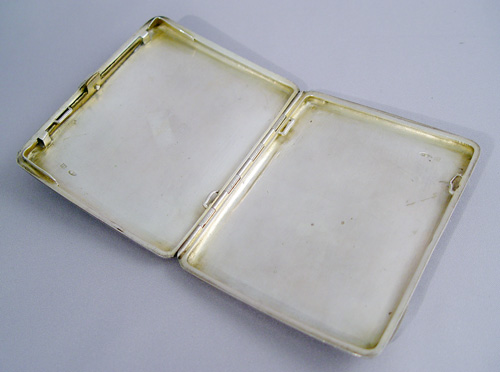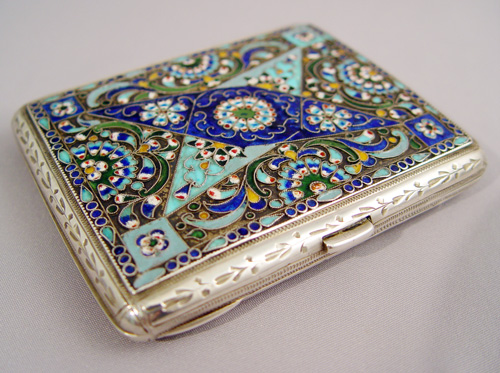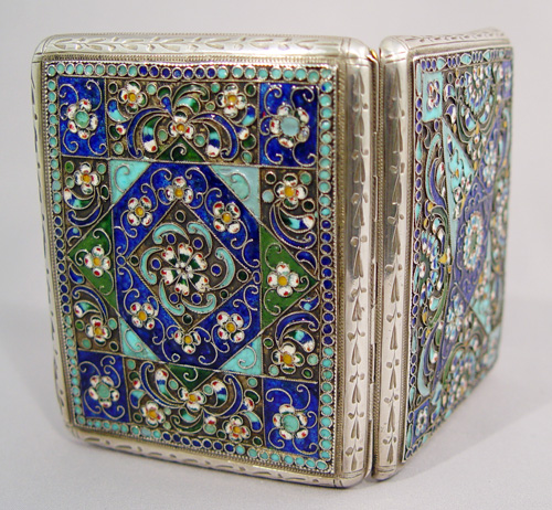 RUSSIAN ENAMEL CIGARETTE CASE: Moscow 1896-1908, silver content 84, maker unknown. Tooled border frames the enamel work. 4'' x 3 1/4''.