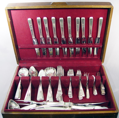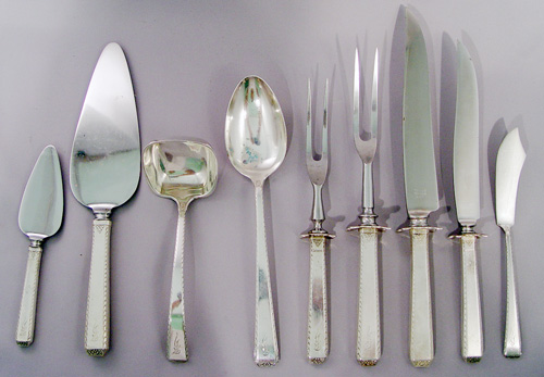TOWLE DRURY LANE STERLING FLATWARE: 90 pieces to include 10 dinner forks (7 1/2''), 10 dinner knives (9 3/4'' 5 pitted blades), 6 salad forks, 6 soup spoons, 12 iced tea spoons, 8 teaspoons, 12 cocktail forks, 7 butter spreaders, a casserole spoon, a meat fork, jelly spoon, small slotted spoon, pickle fork, lemon fork, 4 demi-tasse, master butter, 2 carving forks, 2 carving knives, serving spoon (pitted), cake server, cheese server, and a slotted bon-bon server. Monogrammed.