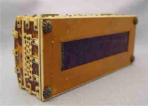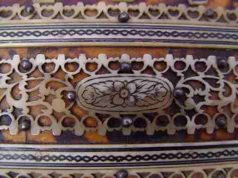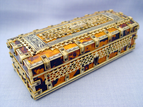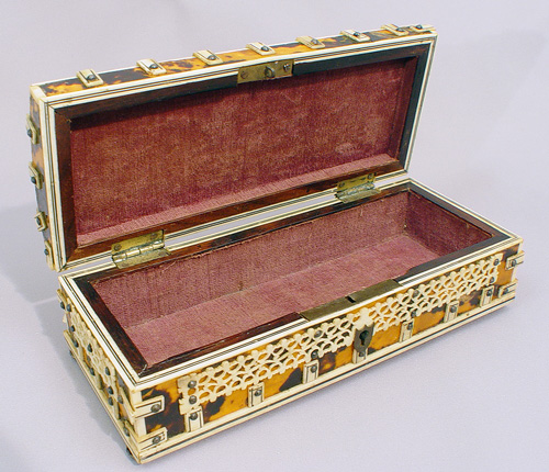 TORTOISESHELL AND IVORY BOX: Tortoiseshell with ivory banding and carved ivory filigree on the hinged top. 2'' x 7'' x 2 5/8''. Est. $600/800**