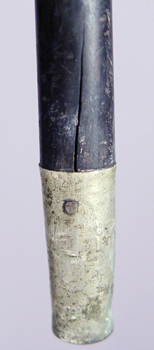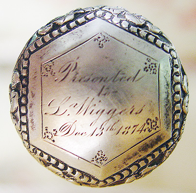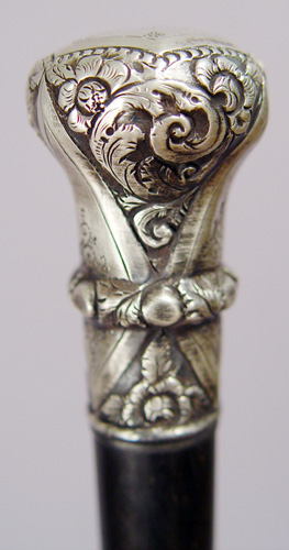 STERLING HANDLE WALKING STICK: Inscribed ''Presented to L. Wiggers Dec. 13 1874''. 34''h.