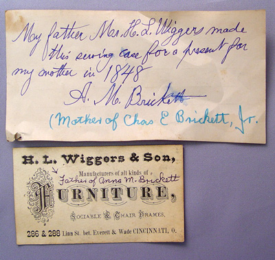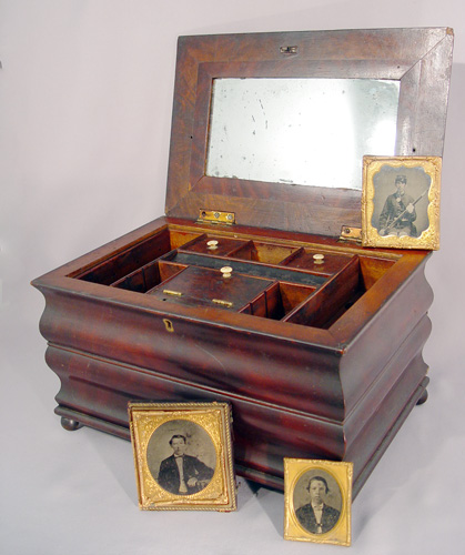 MID 19TH C MAHOGANY SEWING BOX: Made by H.L. Wiggers for his wife, the grandmother of Charles Brickett in 1848, compartmented interior with pin cushion. Sold with the business card of H.L. Wiggers, and a hand written note by A.M Brickett, mother of Charles Bricket. 7 1/2''h. x 12'' x 8''. The old photographs seen in the photo belong to the family link at lot 88.