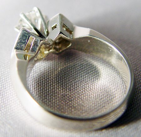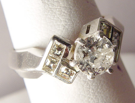 90ptw DIAMOND ENGAGEMENT RING: Center by a round brilliant stone of 63pts, appearing larger as faces like an 80 pt stone, prong set in 14k white gold mount and flanked on each side with square step cut diamonds, channel and bezel set, of approx. 30pts total. Size 6, 5.5 grams.