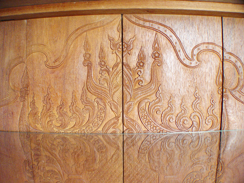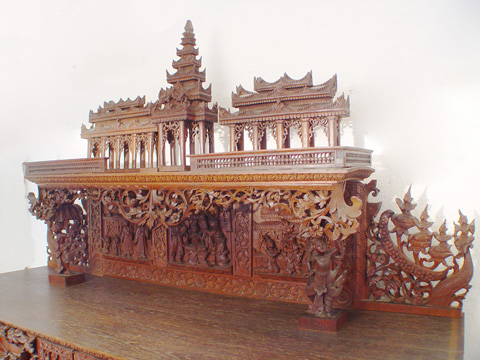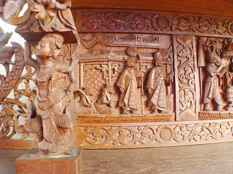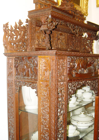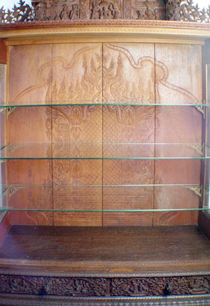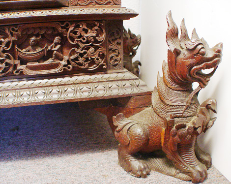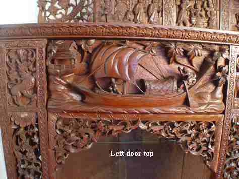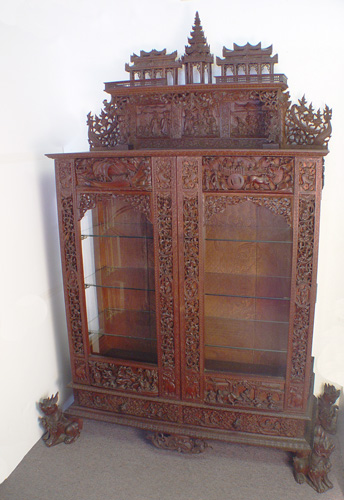 19TH C RICHLY CARVED ASIAN DISPLAY CABINET: Displaying the most intricate of carvings featuring pagoda pediment, figural supports under the garden fences (shelf), and especially the full body foo lions as the feet of the cabinet. Glass doors and sides, virtually every inch of the wood is carved. 88''h x 56''w x 24''d.