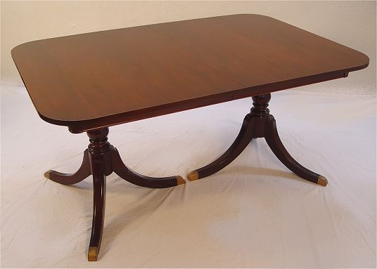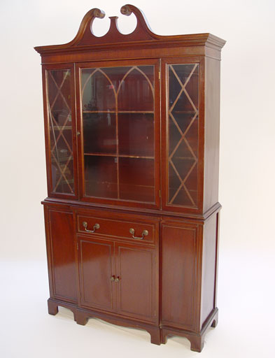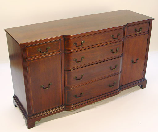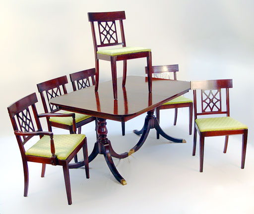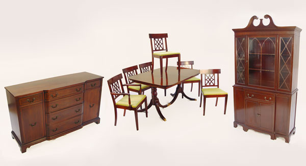 9 PIECE MAHOGANY DINING SUITE: . To include double pedestal dining table, 62'' x 42'', 6 chairs, one having arms, china cabinet, 80'' x 44'' x14.5'', and sideboard with string inlay on solid mahogany, 36''h. x 62'' x20'', it bears the Genuine Solid Mahogany label.