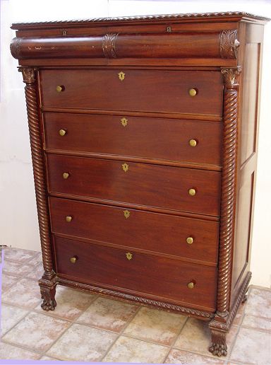 EMPIRE PERIOD MAHOGANY TALL CHEST: Featuring spiral carved full columns, carved paw feet, and gadroon carved top. Two half length ogee drawers over 5 full length drawers, original brass pulls. 65 1/2''h. x 48'' x 24 1/2''. Est. $1400/1600**