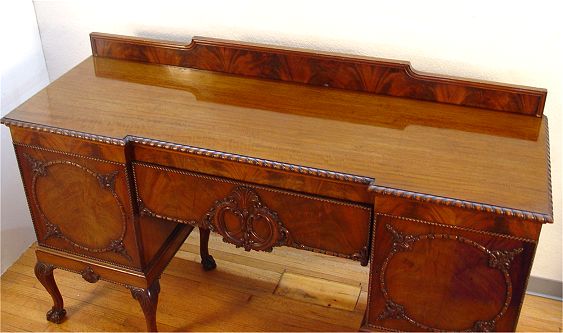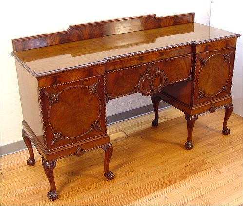 RICHLY GRAINED MAHOGANY CHIPPENDALE STYLE SIDEBOARD: Charles Walker & Sons, Furniture Makers, Hardgate. Deep center drawer flanked by two doors, one with a cellaret drawer, the other with pull out trays. Gadroon edging, applied carvings, and ball and claw feet. 44.5 h.'' x 6'long. x 44'' deep. Est. $2500/3500**