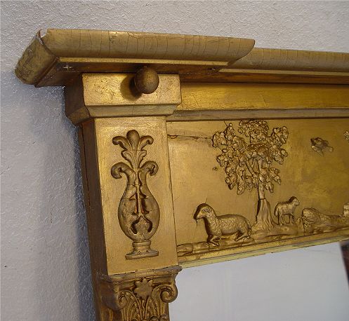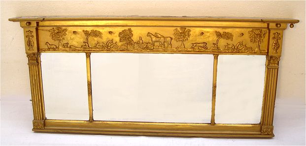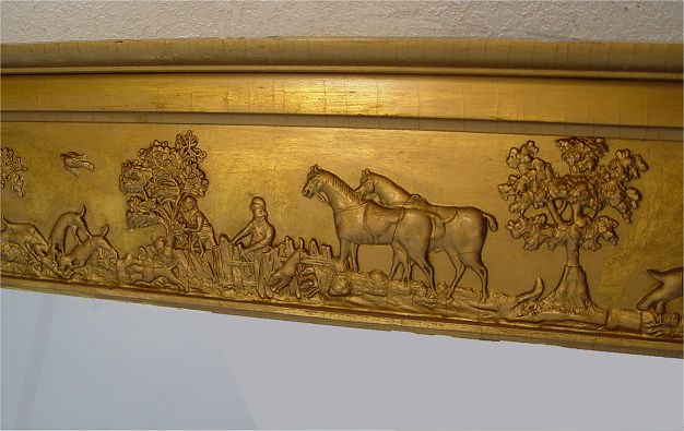 19TH CENTURY CARVED GILT WOOD MIRROR: Across the top is a gentleman's farming and hunt scene. Overhanging cornice at the corners with remnants of the hanging balls, columnar stiles. 29.5''h. x 61'' long.