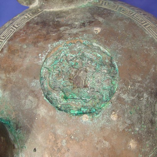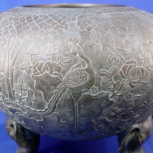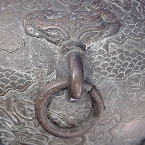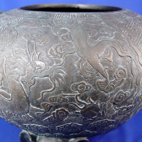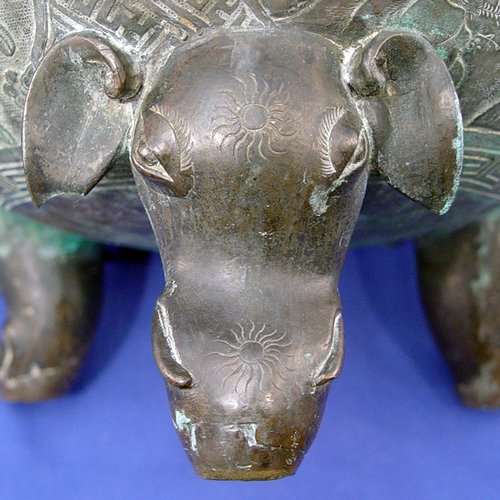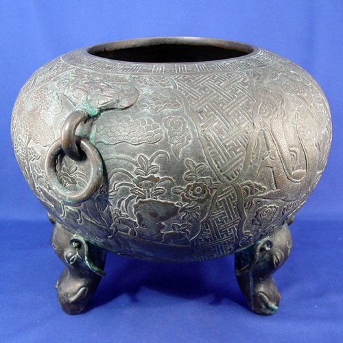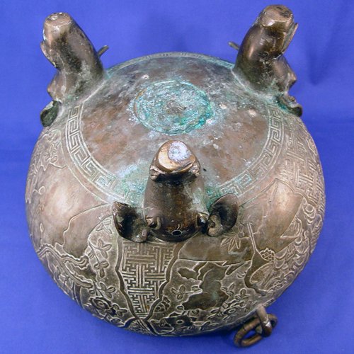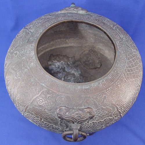 CHINESE BRONZE TRIPOD VESSEL: Raised on animal form feet, bulbous body with Taoist mask ring handles. Ming period. 13''h, 12 1/2'' dia. Est. $3500/4500**