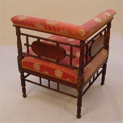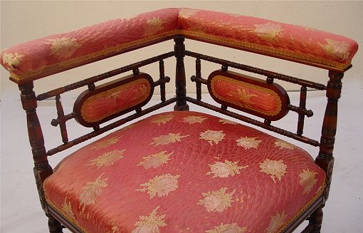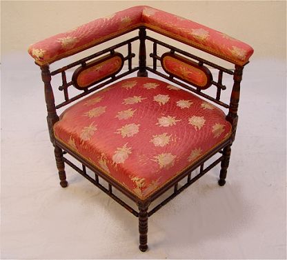 VICTORIAN CORNER CHAIR: Fine walnut corner chair with delicate turned spindles. Originally in the Bishop's Palace, Galveston Texas. 25 1/2'' x 20 1/2'' x 22''.