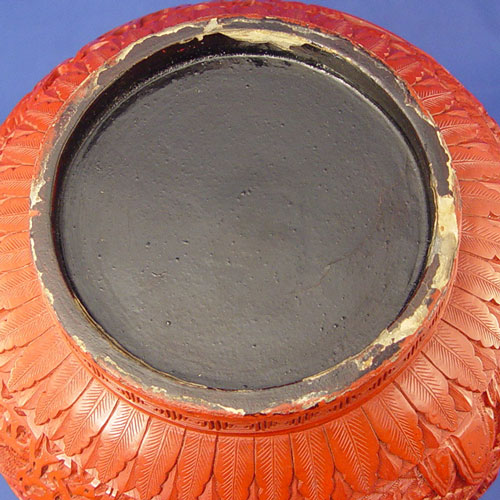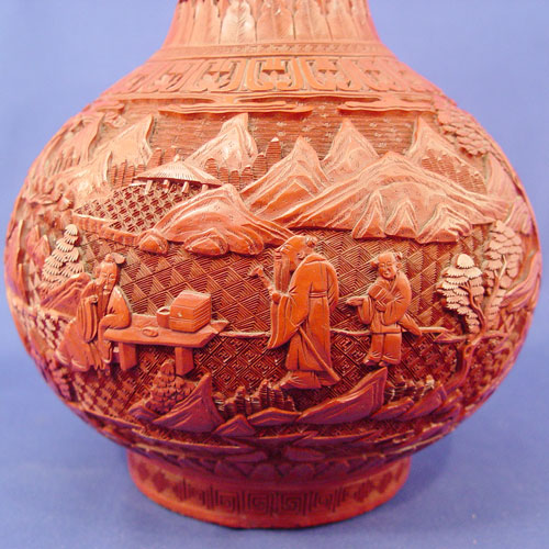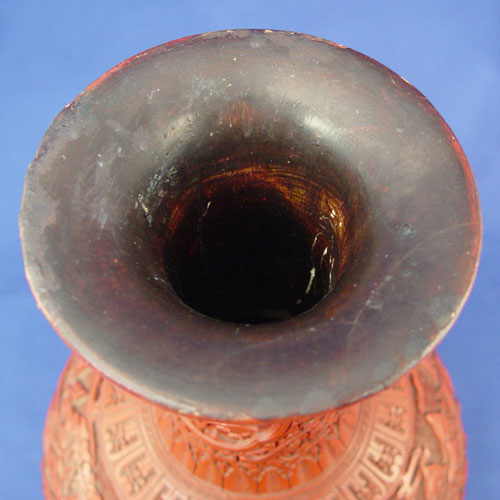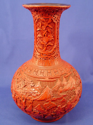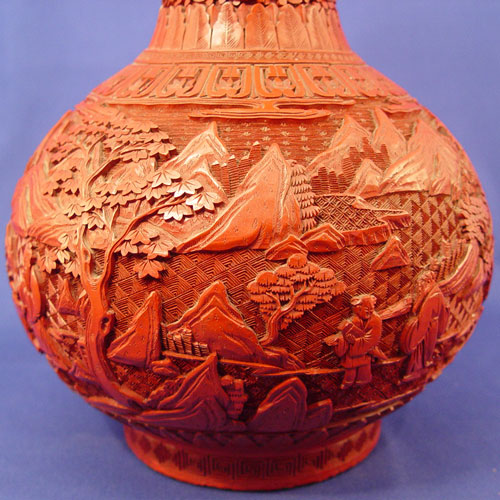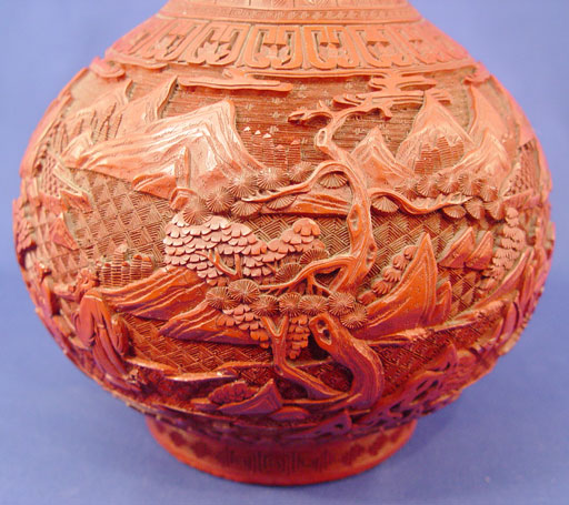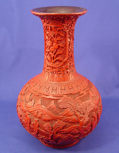 19TH C CHINESE CARVED LACQUER CINNABAR VASE: Bulbous bottle neck vase, unsigned, 12 1/2'' h. Est. $3000/4000**