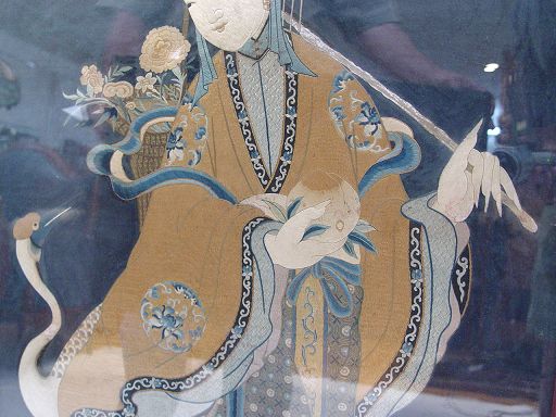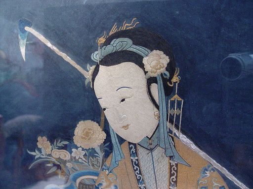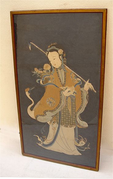 LARGE JAPANESE SILK EMBROIDERY: Striking needlework image of a woman in blue brown , done in silk threads. Her hair ornaments are worked in metallic thread. Framed under glass 49 1/2'' x 28 1/4''.