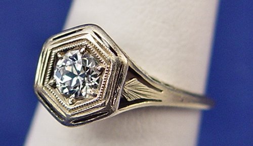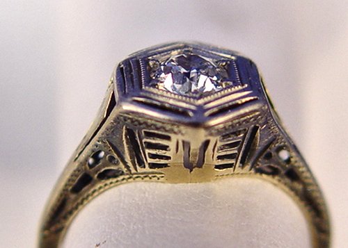 ESTATE DIAMOND FILIGREE RING: Old Euro cut diamond of approx. 35pts, set in hexagonal filigree mount of 14k yellow gold, size 5, 2.2 grams.