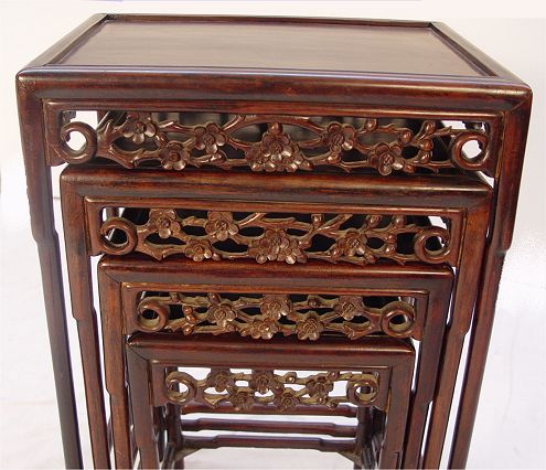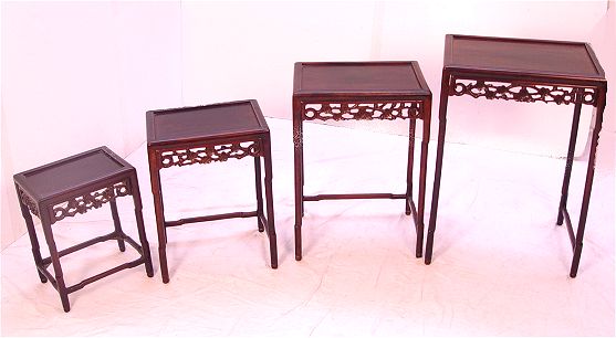 NEST OF 4 CHINESE CARVED TABLES: Tallest is 28''h. x 24 1/2'' x 14'', and is missing the back stretcher.