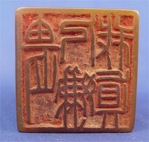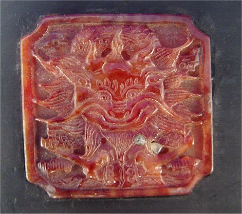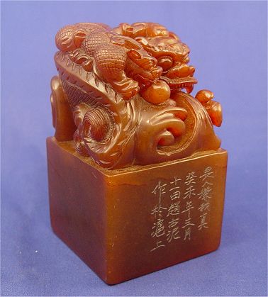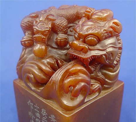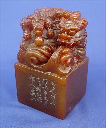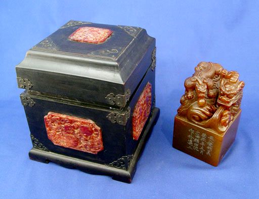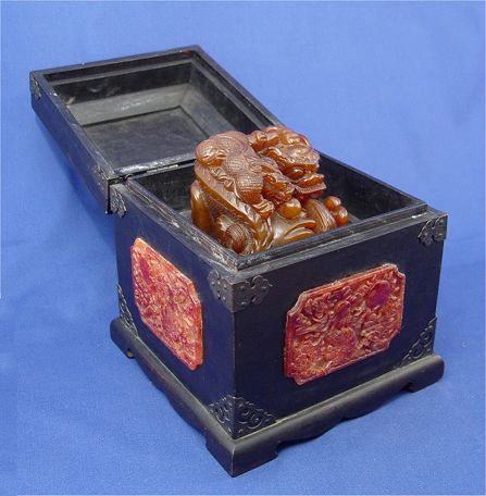 CHINESE CARVED STONE SEAL IN STORAGE BOX: Carved red hard stone Qi Ling seal stored in a box also decorated with hard stone. The seal is 5'' x 3 '' x 3 1/2''. The hinged box is 7'' x 6'' x 6''. Est. $800/1200**