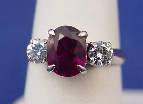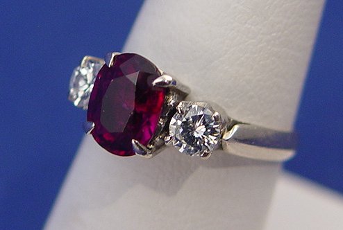 ESTATE RUBY AND DIAMOND RING: 18k white gold ring set with an oval mixed cut ruby of approx. 1.85ct and two round brilliant cut diamonds, approx. .47ctw VS1 clarity and G-H color, size 5.5, 3 grams. Sold with current Florida Diamond Appraisers appraisal, $4650 retail replacement value.